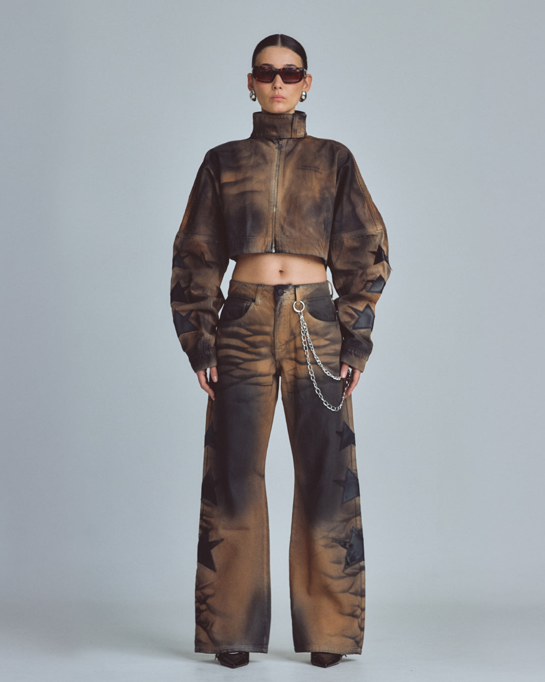 W Stardust Stars Tall Neck Zip Up Jacket Vintage Brown